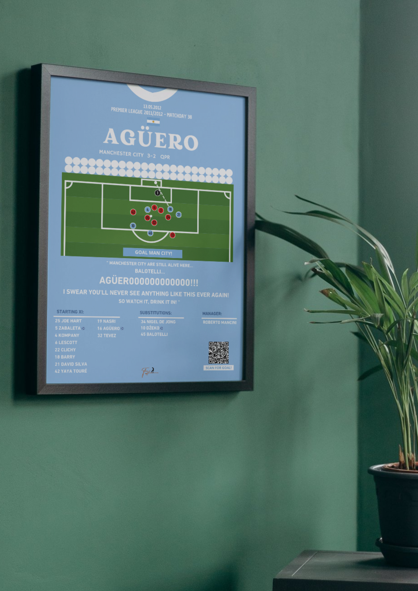 Immortalize forever Aguero's goal against QPR in the last matchday of the 11/12 Premier League Season. City needed a win to decide the title, and with only seconds left Aguero scored one of the most iconic goals in football history.