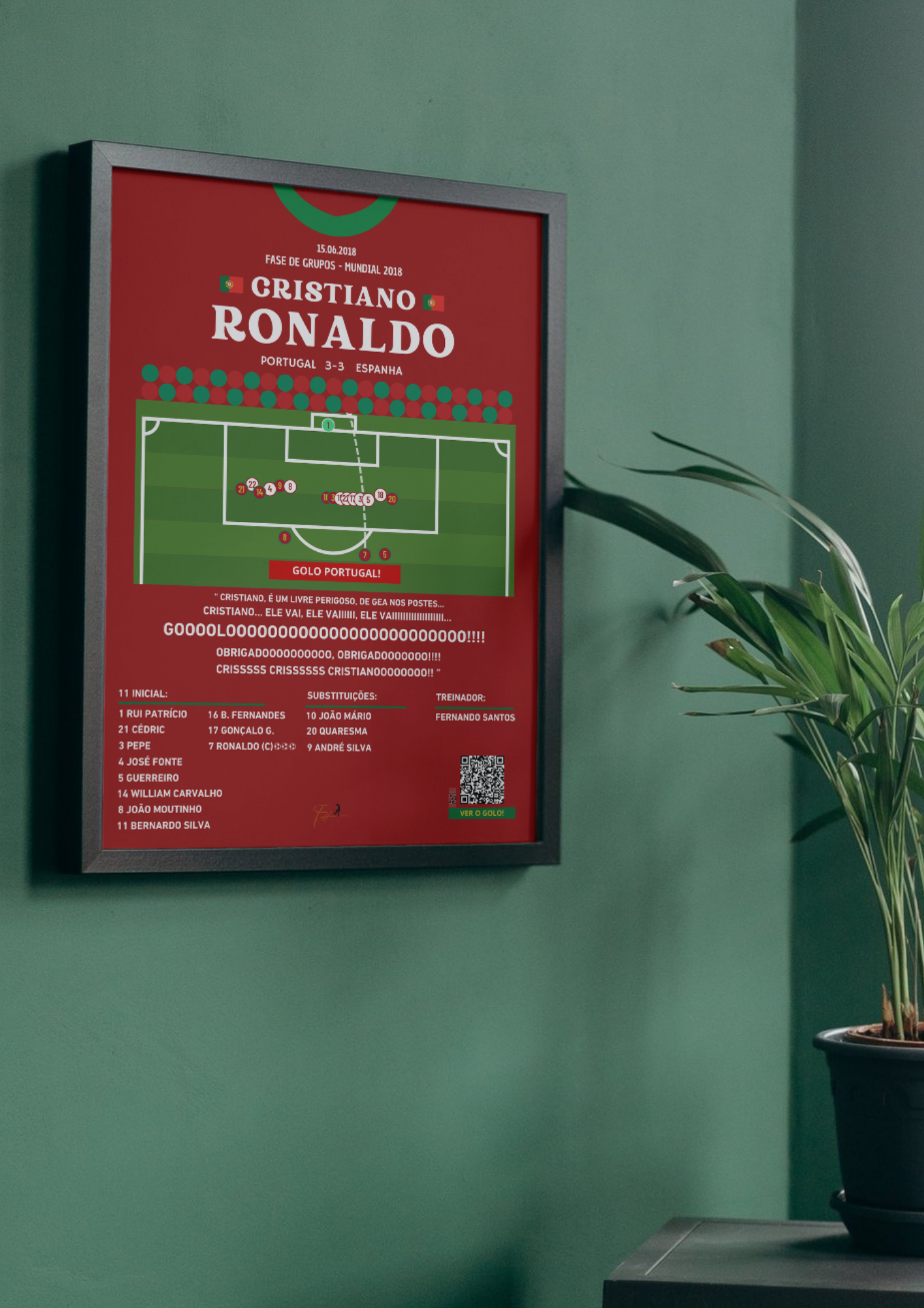 Impresso em papel fosco de alta qualidade, equipado com uma moldura de madeira preta. Este golo certamente resistirá ao teste do tempo, oferecendo memórias para a vida toda, perfeitas para decorar qualquer ambiente.